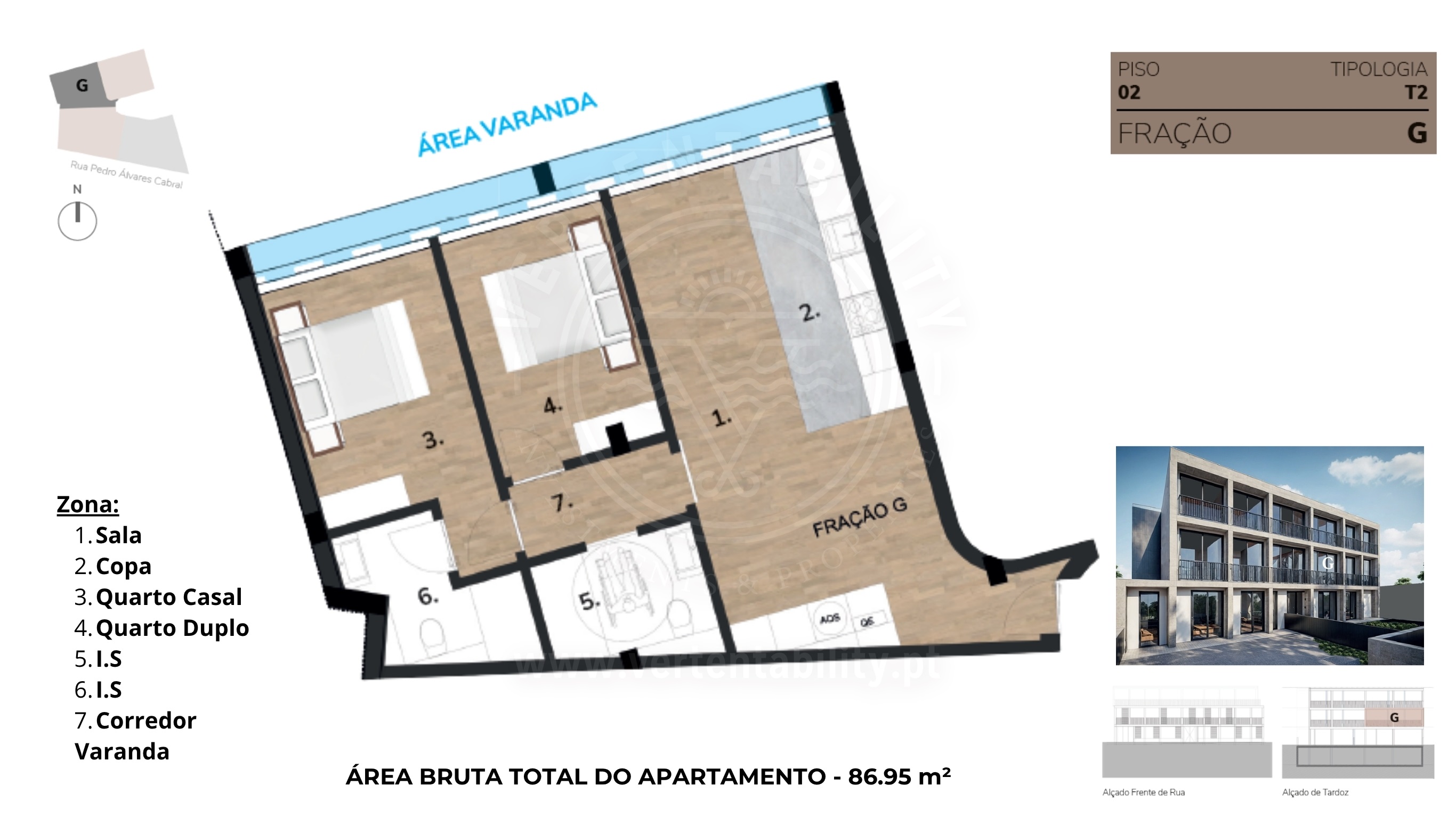 Apartamento T2, fração G, com uma área de 86,95 m².