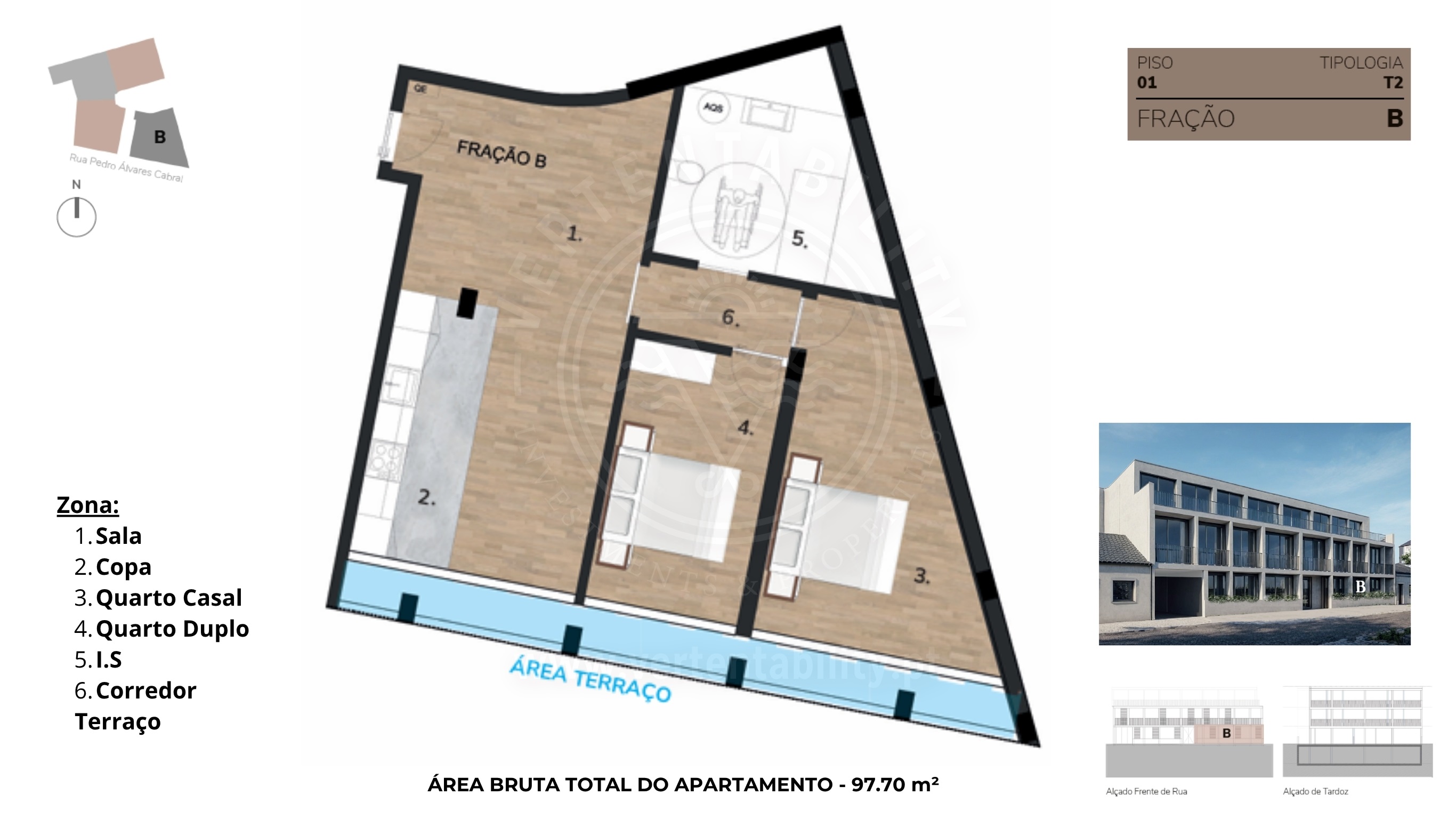 Apartamento T2, fração B, com uma área de 97,70 m².