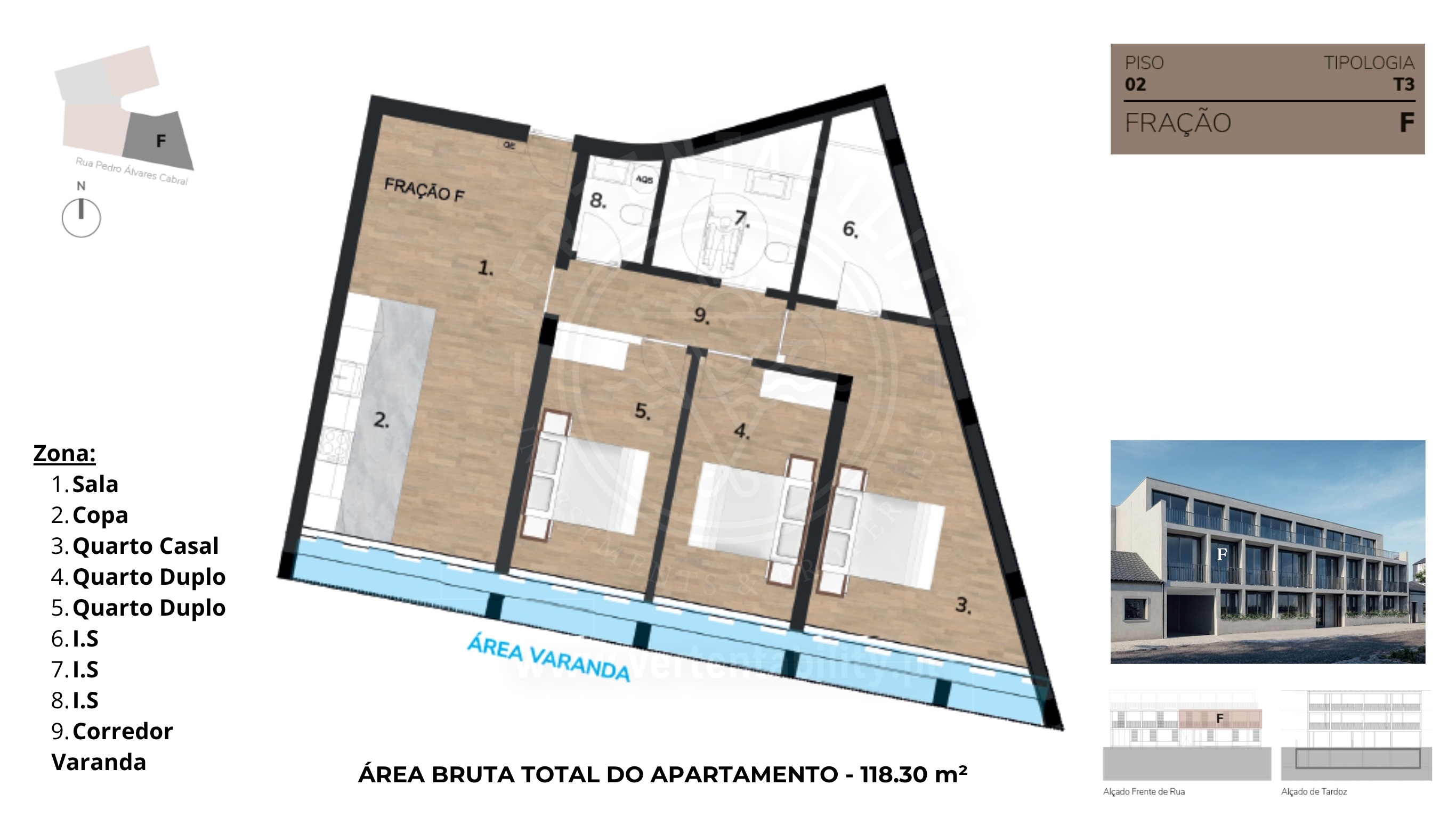 Fração F, localizada no piso 2 (1º andar), com uma área bruta de 118,30 m² e com exposição a Sul.
